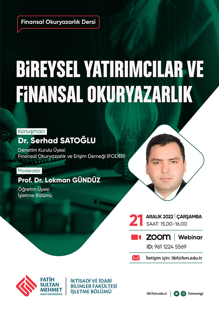 İşletme Bölümü başkanımız Prof. Dr. Lokman Gündüz tarafından verilmekte olan "Finansal Okuryazarlık" dersi kapsamında şekillenen programlar serisinde, Finansal Okuryazarlık ve Erişim Derneği (FODER) Denetim Kurulu üyesi Dr. Serhad Satoğlu konuğumuz olacaktır.